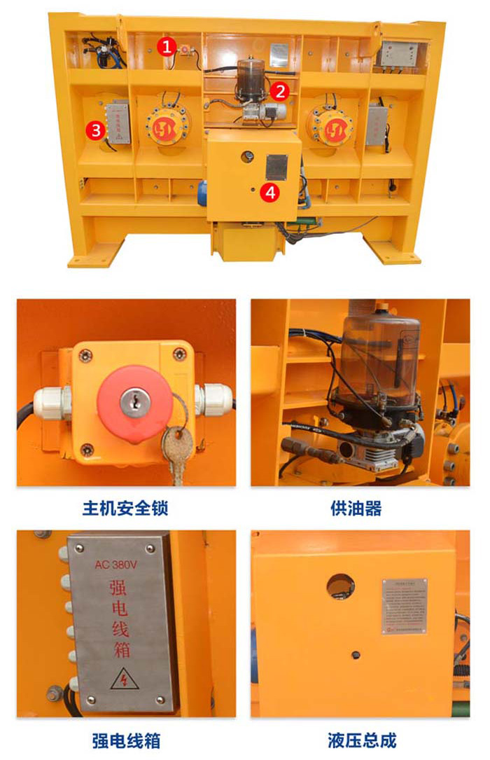 JS2000攪拌機的上料系統(tǒng)由卷揚機構、上料架、料斗、進料嘴等部分組成。